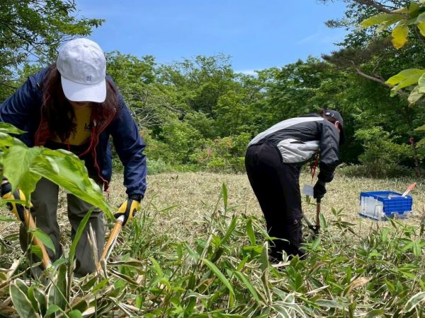 そこで、優占しているミヤコザサを丁寧に刈り取ることで、地表に光を当て、地中に眠っていた