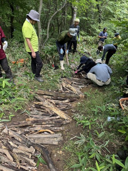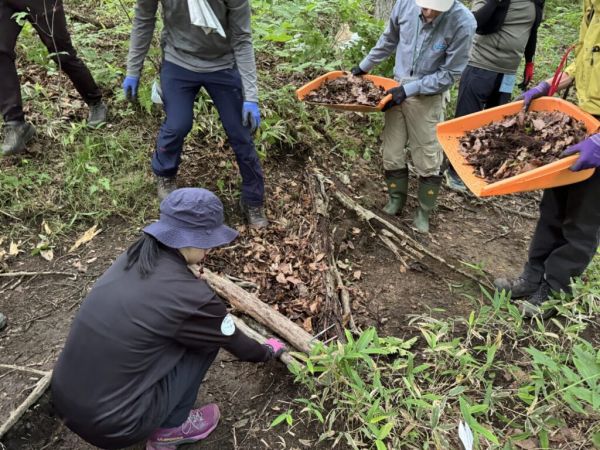 ※那須平成の森の落ち葉や小枝、木材などを組み合わせて荒れてしまった歩道をみんなで一緒に考えながら直します。