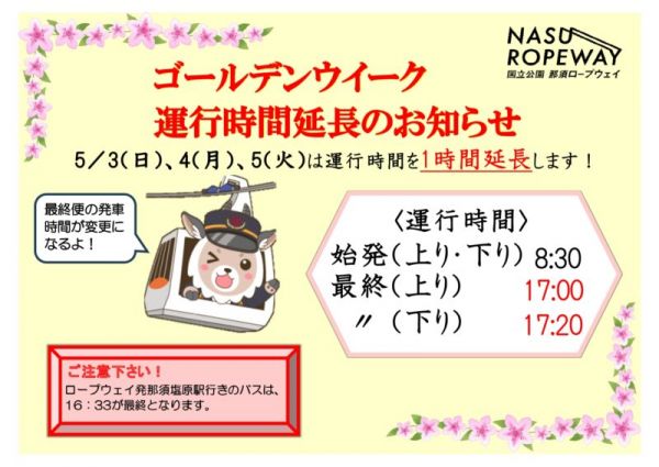 ゴールデンウィーク期間中の5/3(日)、4(月)、5(火)の3日間は、通常より運行時間を1時間延長いたします。