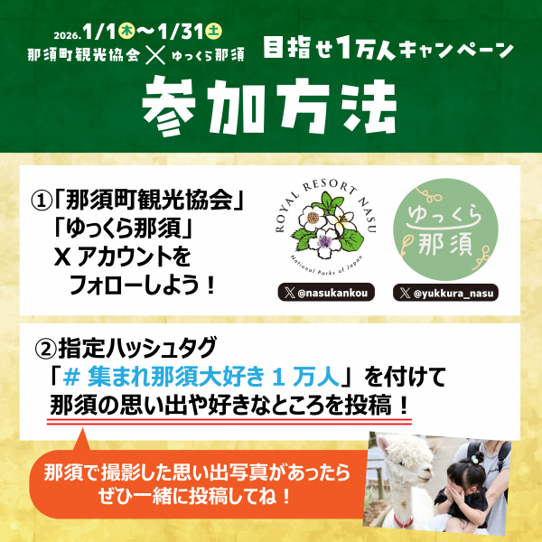 ②キーワードを #集まれ那須大好き1万人 付けて、那須の思い出やすきなところを投稿