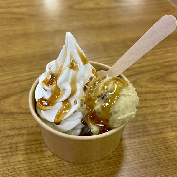 「いもちゃんソフト」が南ヶ丘牧場にて現在販売中です‼ 那須町立田代友愛小学校の6年生が那須町を盛り上げようと考案した特製ソフトクリームで、学校で収穫したサツマイモと南ヶ丘牧場のミルクジャムを混ぜたお芋あんをトッピング!